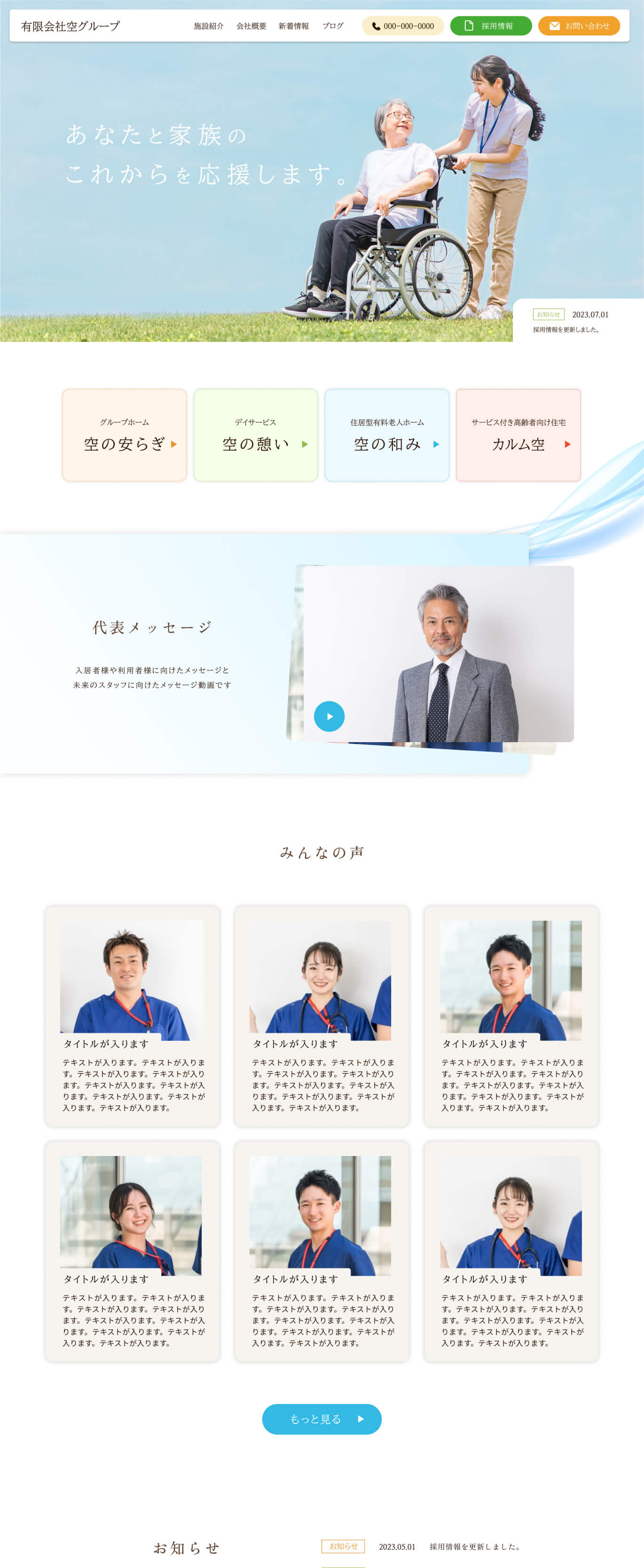 介護施設の誠実や丁寧さを出すために、フォントは明朝体をベースとし、「みんなの声・ブログ」は読みやすさ重視としてゴシック体を使用した。