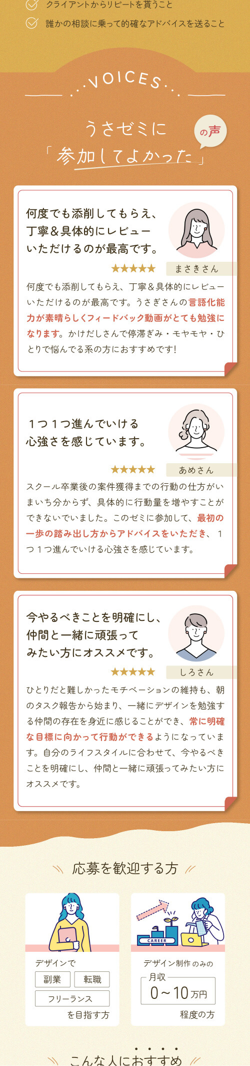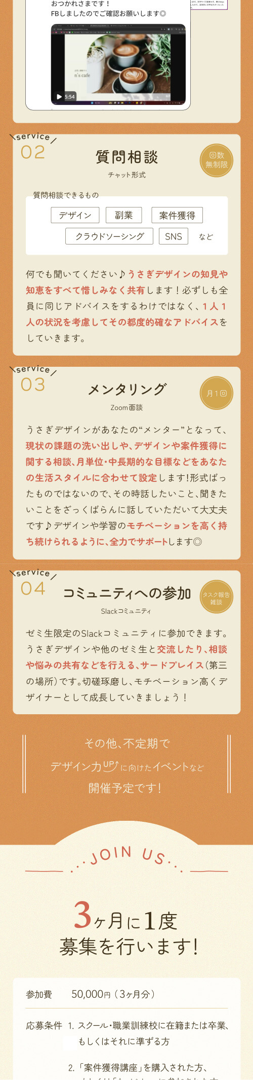 初めてのLP制作であり、構成を調べて情報設計を行なった。またライティングでは、上から読み進めた時に詰まることなく最後まで読み進めることのできるようユーザーの心理やCTAの位置を考えて作成。FVにはコミュニティ名と訴求ポイントを分かりやすく配置した。